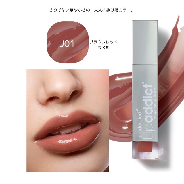 サロン級リップグロス # J01 Nude Espresso(ブラウンレッド ラメなし) さりげない華やかさの大人の抜けカラー。 soaddicted リップアディクト (口唇用美容液) 7ml 6,600円税込 『美容関係者が選ぶ最も効果があると思うリップ』など3冠獲得! まるで塗るヒアルロン酸!サロン級リップグロス ヒアルロン酸やオーガニックオイルの効果で潤いを与え角質層に周防文を閉じ込めて、気になるかさつきを防ぎ、ふっくらとした檀両区のある唇に導いてくれます。 継続して使用すればエイジングケア効果も! 【STEP.1】 乾いた唇にたっぷりと塗布し、指やブラシでなじませます。 【STEP.2】 唇のシワを埋めるようにリップを塗り込むと、ふっくら感を感じやすくなります。 ・成分により塗ってから30秒ほどでぴりぴりとした感覚があります。 ・お肌に合わないときは使用をお止めください。 ・唇以外にはご使用いただけません。 ・傷や腫物、湿疹、かぶれ等、お肌に異常があるときはお使いにならないでください。