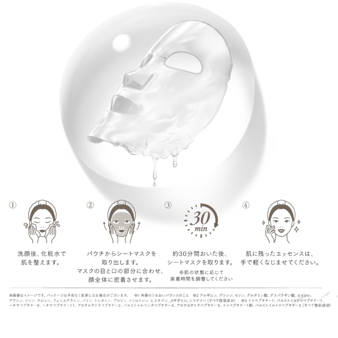 美容液30mLをたっぷり1枚に。ヒアルロン酸Na(保湿)を始め、17種のアミノ酸(保湿)、9種のペプチド(整肌)とツボクサ抽出物TECA※1を贅沢に配合されており、肌に⽔分をチャージし、肌荒れを防ぎ、みずみずしく、キメの整えた透明感とハリ感のある肌印象へ。